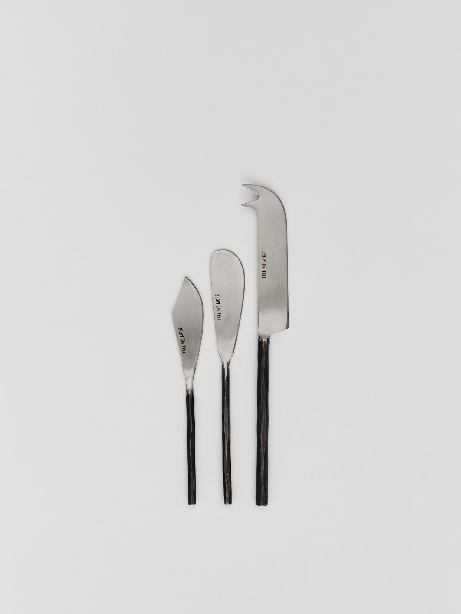 Vackra handgjorda ostknivar i stål som ger en rustik och tidlös känsla till serveringen. Knivarna är smidda för hand vilket gör varje del unik i karaktär. Kombinationen av det matta, opolerade skaftet och det polerade bladet skapar en vacker kontrast och en känsla av genuint hantverk. Perfekta att använda till ostbrickan eller som en fin detalj vid servering. Ostknivarna finns i två storlekar.